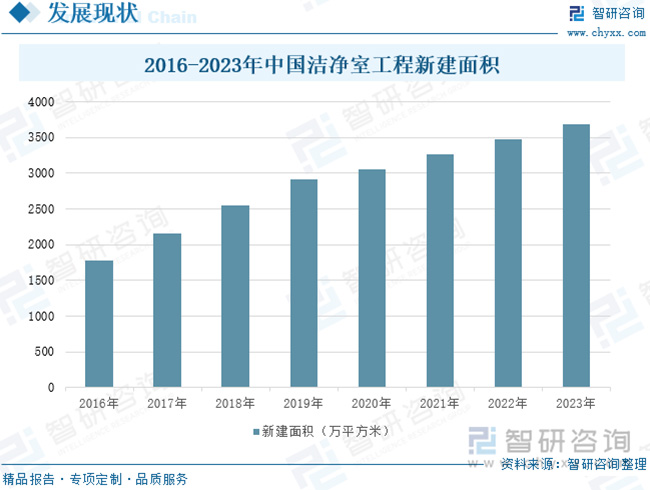 潔凈室工程是服務(wù)于高科技、國計民生的常青產(chǎn)業(yè),尖端科技的發(fā)展與居民日常生活質(zhì)量的提升無不有賴于潔凈技術(shù)發(fā)展作為其幕后的支持。近幾年來,隨著空氣凈化核心領(lǐng)域技術(shù)實現(xiàn)根本性突破,國產(chǎn)凈化設(shè)備及系統(tǒng)集成快速成長,在產(chǎn)品質(zhì)量、制作成本、凈化性能等方面取得長足進步,潔凈室相關(guān)技術(shù)與服務(wù)也從醫(yī)學(xué)、航空航天等高端產(chǎn)業(yè)逐漸向全社會滲透,在食品生產(chǎn)和流通各環(huán)節(jié)、高端裝備制造、大型數(shù)據(jù)中心、化工產(chǎn)品生產(chǎn),甚至美容化妝等領(lǐng)域都取得了廣泛的應(yīng)用。目前,全球半導(dǎo)體、光電等電子信息產(chǎn)業(yè)在世界范圍內(nèi)轉(zhuǎn)移,東亞、東南亞等地區(qū)已成為世界電子信息行業(yè)的主要市場和發(fā)展重心;同時由于我國醫(yī)藥衛(wèi)生、半導(dǎo)體、航空航天等事業(yè)的不斷發(fā)展,加速推動了潔凈室的市場化需求,從而帶動我國潔凈室工程產(chǎn)業(yè)的快速發(fā)展。2023年,中國潔凈室工程新建面積達(dá)3689萬平方米,同比增長6.04%。