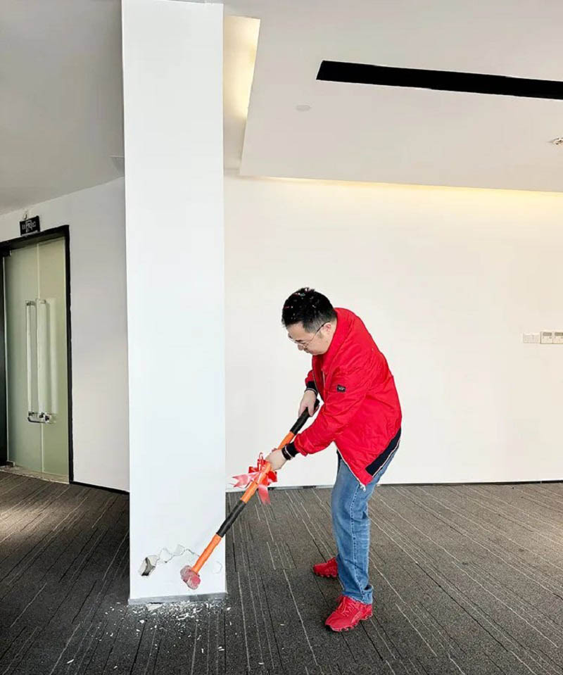 紅桌、紅錘、紅毯,色澤鮮亮紅潤的乳豬,紅紅火火!一錘開工大吉,二錘財源廣進,三錘萬事如意!伴隨著禮花的綻放,合景人手握禮錘,一同為新辦公區(qū)裝修開工儀式揭開序幕。在熱烈的掌聲中,大家共同慶祝辦公樓裝修工程的正式啟動!